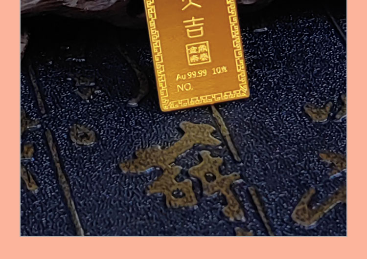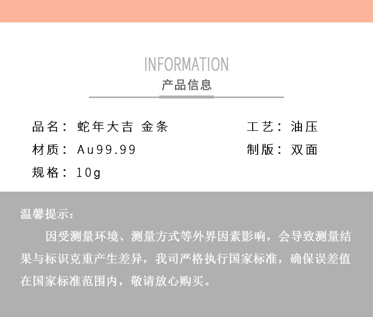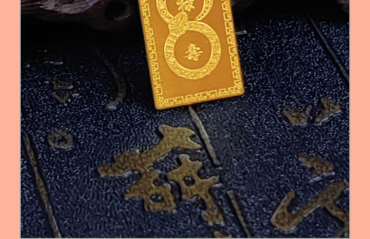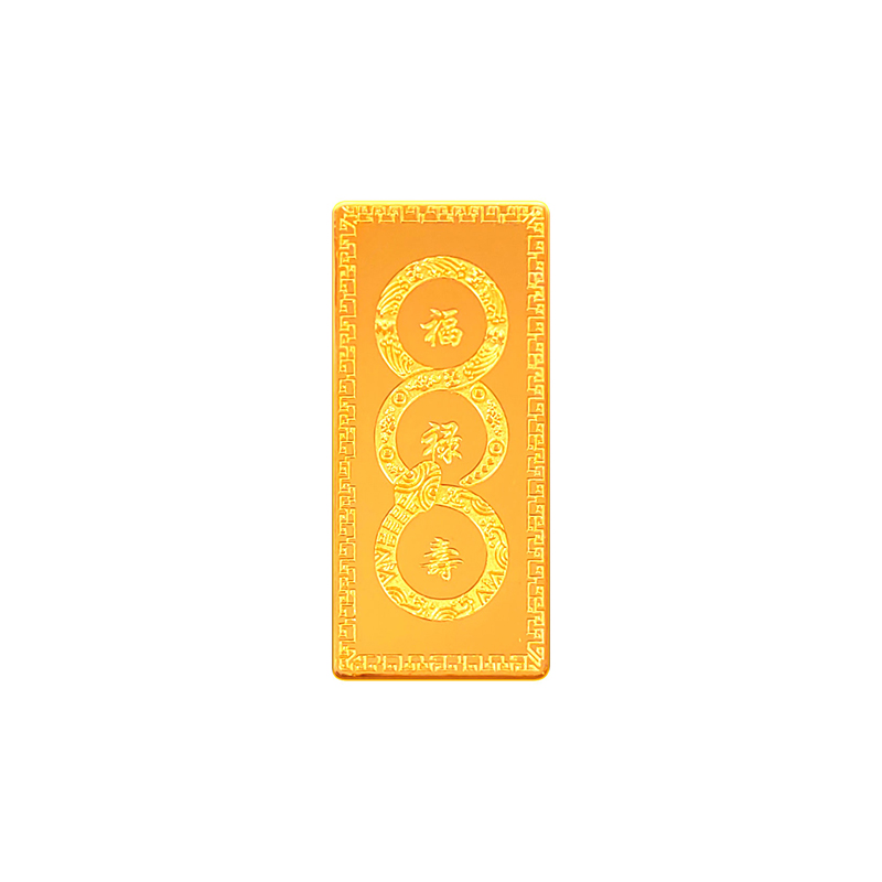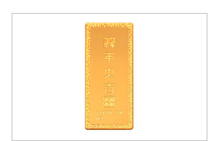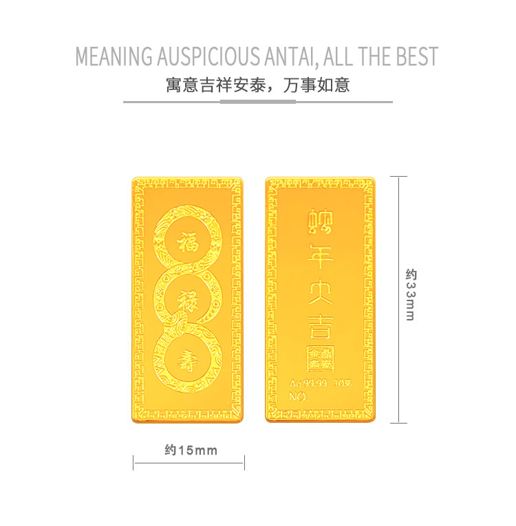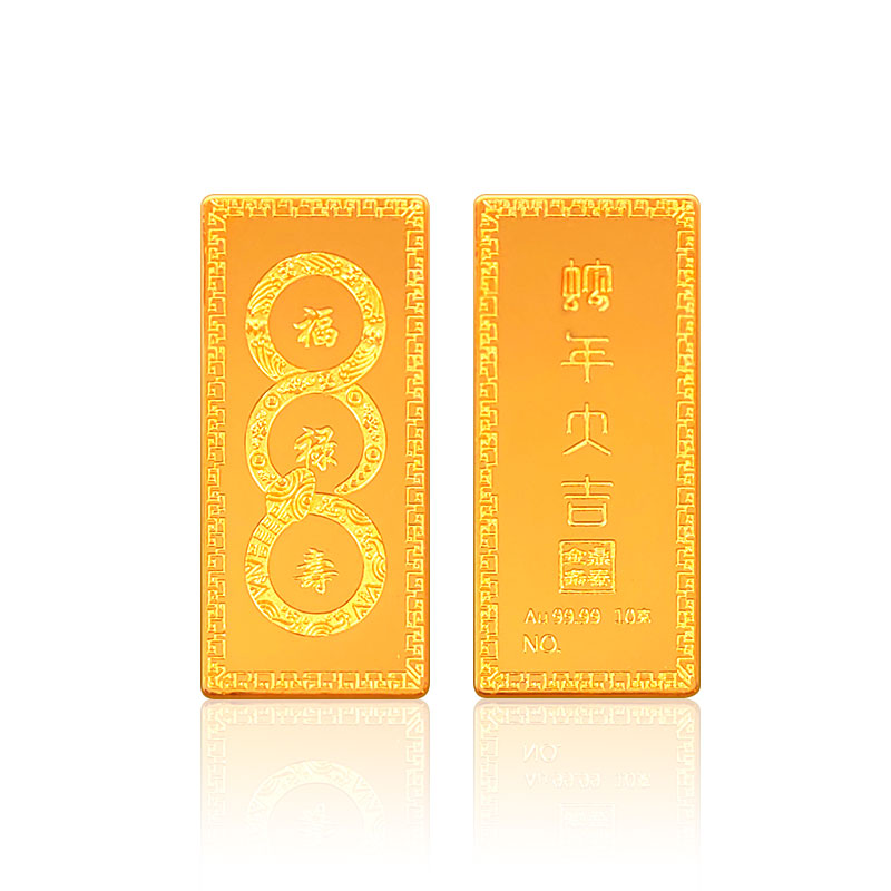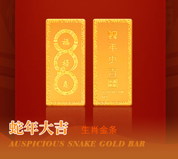 蛇年大吉10克生肖金條正面為一條以三連環(huán)圓形(代表前世、今生,來世)游走,蛇身回旋盤繞的金蛇造型。金蛇身姿形成的圓形各圍繞一個祝福字,分別為福、祿、壽。環(huán)繞福字蛇身圖案為五只蝙蝠與祥云,祿字蛇身圖案為金錢牡丹,壽字蛇身圖案為南山不老松,東海長流水,此謂蛇年大吉主題。整體設(shè)計寓意五福齊聚,財源通達,前程似錦,健康長壽的美好祝愿。