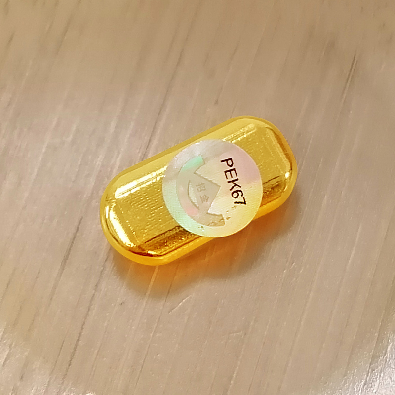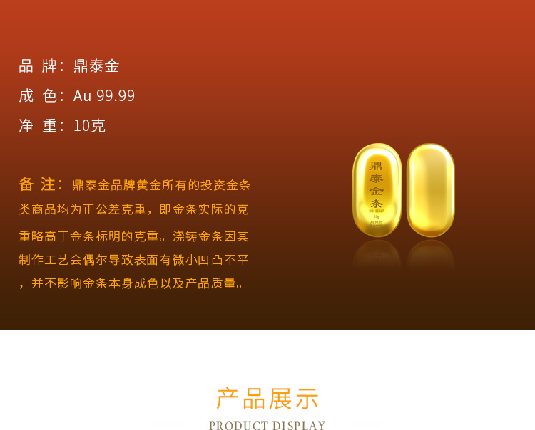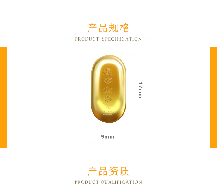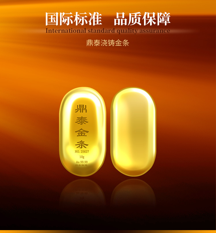 出品品牌為“鼎泰金”,經(jīng)澆鑄工藝制作,外觀圓潤(rùn),色度飽滿,全流程嚴(yán)格按照上海黃金交易所標(biāo)準(zhǔn)制造完成,支持購(gòu)回。金條正面標(biāo)注成色、克重、編號(hào)等標(biāo)識(shí)。