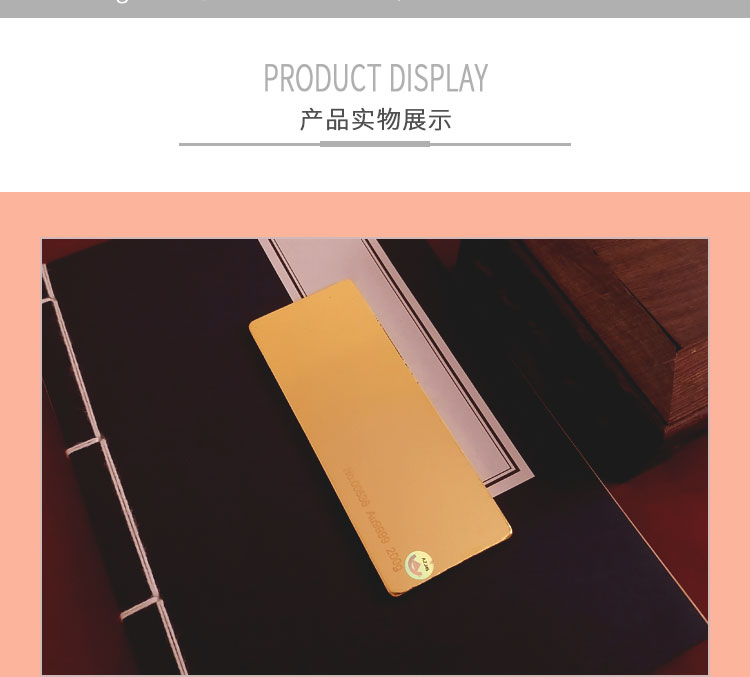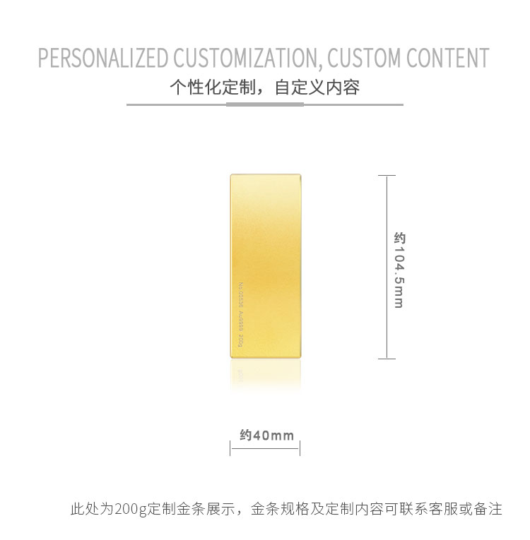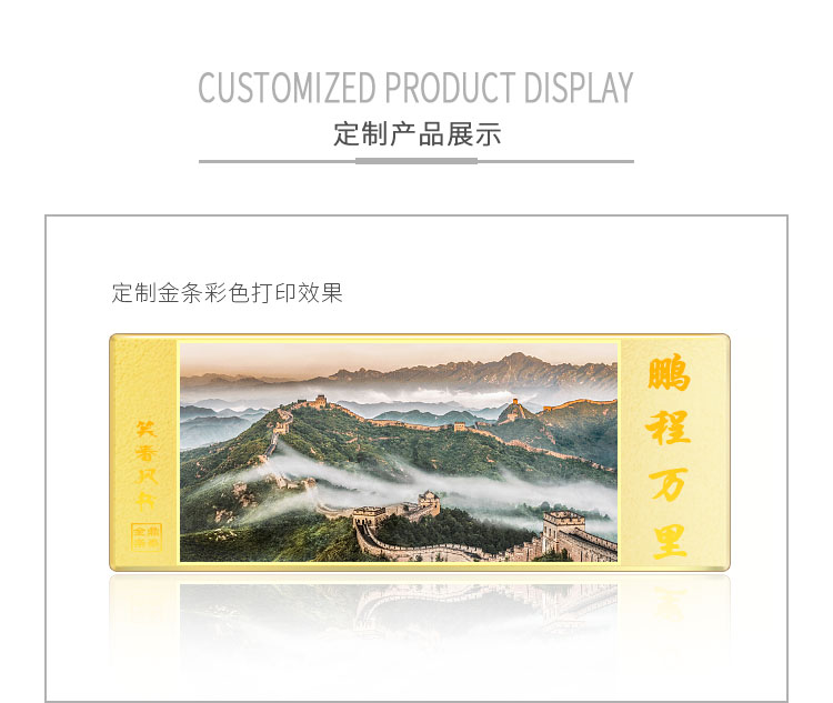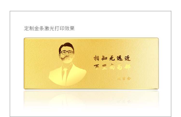 金條可以根據(jù)客戶要求,在金條指定位置處定制激光蝕刻單色圖形或打印彩色圖案??捎糜谥苣陸c典、年終年會、企業(yè)上市、個(gè)人定制、喬遷紀(jì)念、答謝回饋、員工福利、節(jié)日送禮等,十分適合做為紀(jì)念、留念或饋贈禮品,同時(shí)兼具投資保值價(jià)值。