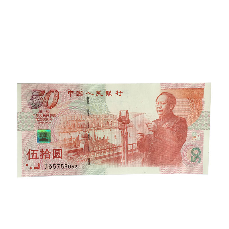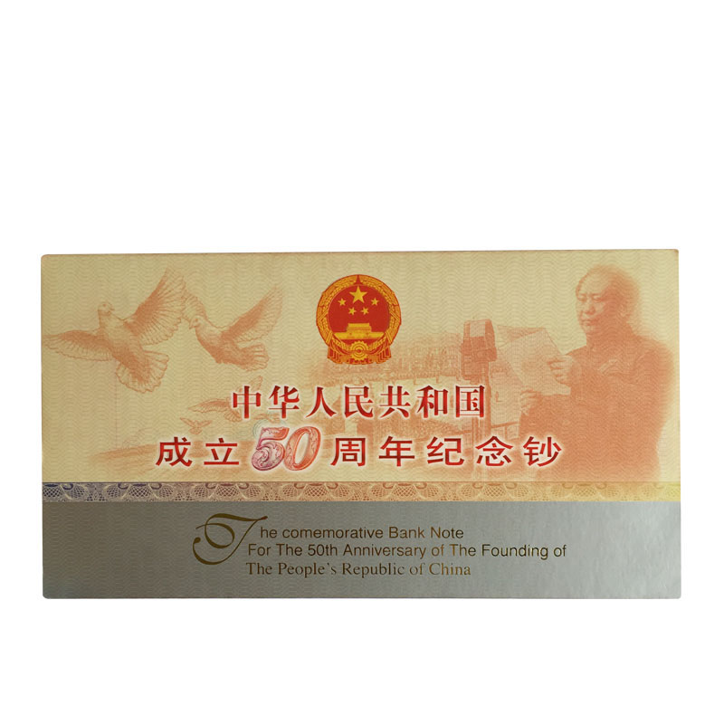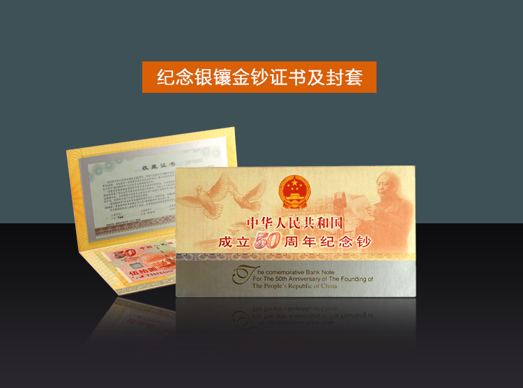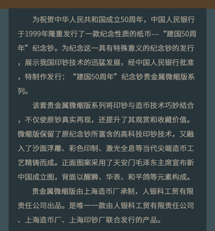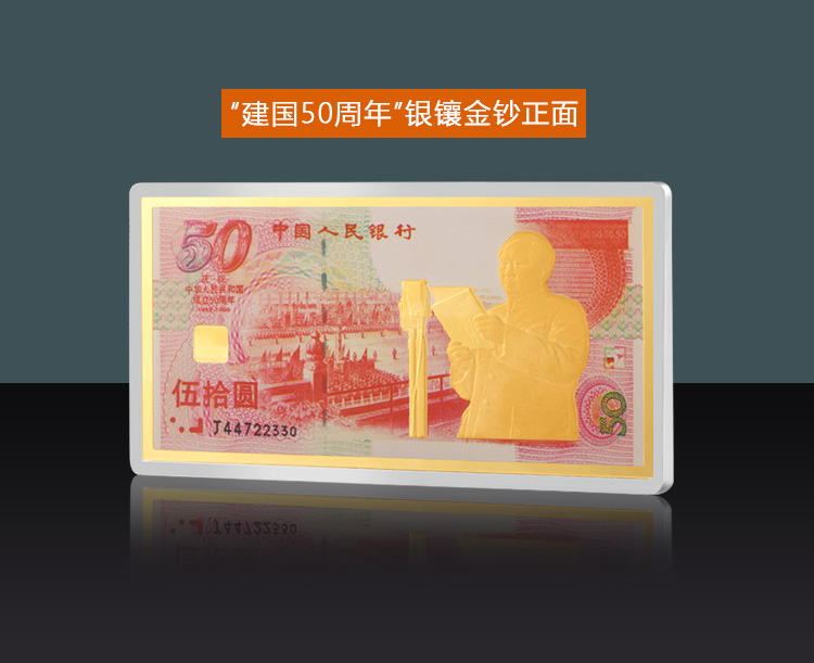 為祝賀中華人民共和國(guó)成立50周年,中國(guó)人民銀行于1999年隆重發(fā)行了一款紀(jì)念性質(zhì)的紙幣---“建國(guó)50周年”紀(jì)念鈔。為紀(jì)念這一具有特殊意義的紀(jì)念鈔的發(fā)行,展示我國(guó)印鈔技術(shù)的迅猛發(fā)展,經(jīng)中國(guó)人民銀行批準(zhǔn),特制作發(fā)行:“建國(guó)50周年”紀(jì)念鈔貴金屬微縮版系列。該套貴金屬微縮版系列將印鈔與造幣技術(shù)巧妙結(jié)合,不僅使原鈔真實(shí)再現(xiàn),還提升了其觀賞和收藏價(jià)值。微縮版保留了原紀(jì)念鈔所富含的高科技印鈔技術(shù),又融入了沙面浮雕、彩色印制、激光全息等當(dāng)代尖端造幣工藝精鑄而成。該貴金屬微縮純金版,含99.9%純金198克,限量發(fā)行1000套;銀鑲金版含99.9%純金18克,含99.9%純銀128克.限量發(fā)行3000套;純銀版含99.9%純銀128克,限量發(fā)行8000套。每套隨附編號(hào)收藏證書及“建國(guó)50周年”紀(jì)念鈔一張。貴金屬微縮版由上海造幣廠承制,人銀科工貿(mào)有限責(zé)任公司出品。是唯一一款由人銀科工貿(mào)有限責(zé)任公司、上海造幣廠、上海印鈔廠聯(lián)合發(fā)行的產(chǎn)品。產(chǎn)品極具收藏觀賞價(jià)值。